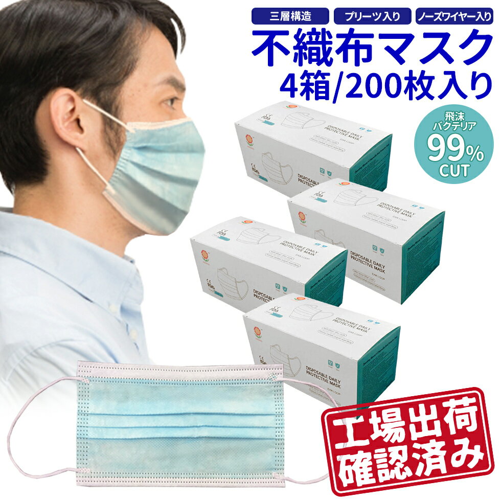 【不織布マスク/4箱200枚入り】 ●三層構造 ●ノーズワイヤー入り ●プリーツ入り 素材:スパンボンド不織布/メルトブロー不織布 サイズ:約9.5cm×約17cm 製造国:中国 ※注意※ ●感染を完全に防ぐものではありません。
